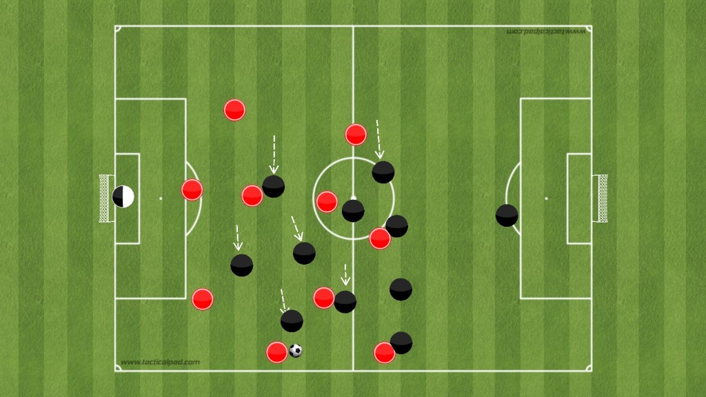Several times through pre-season, the player on the ball would see that Laurent is marked, and Manhoef would be on the front line, unable to receive the pass. In that case, Wilmot would’ve played the red arrow pass out to Tchamadeu, where he may have been trapped in the wide area with only a marked Manhoef ahead.