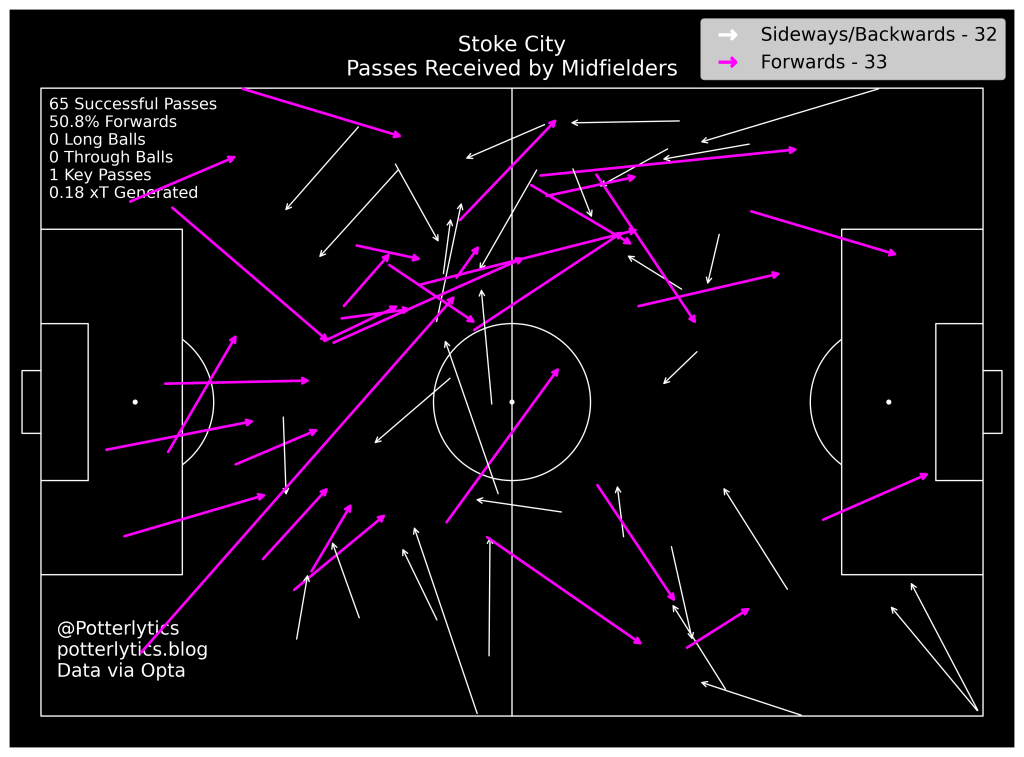 And as a slight aside, we also see that a large proportion of those passes are made inside the pitch to the centre mids. We didn’t see as much of the centre mids dropping into full back areas as the end of last season, although I think that may be a result of the space that was available between lines in this match in the first half, alongside the lack of control Stoke had in the second half to build a longer possession phase.