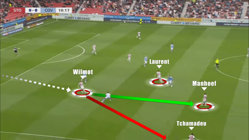 Coventry dropped off and allowed Stoke to keep it in these areas (something they shifted after half time, which led to the change in momentum). As Laurent turns, he has a compact block of Coventry players in front of him, so now plays the wide pass into Wilmot, who drives again towards halfway.