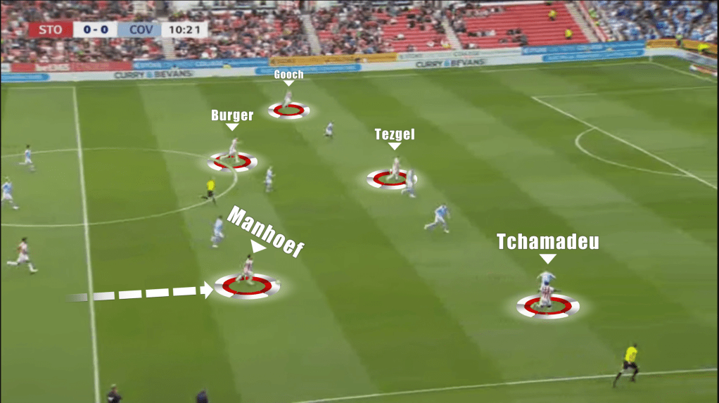 Instead, we see Manhoef drop between the lines as the Coventry wide player presses Wilmot. This means Tchamadeu can bomb on down the wing, occupying the opposing full back. As Wilmot plays the pass into Manhoef, the first line of the press is broken, and he can turn with the ball, driving into the opposition half.