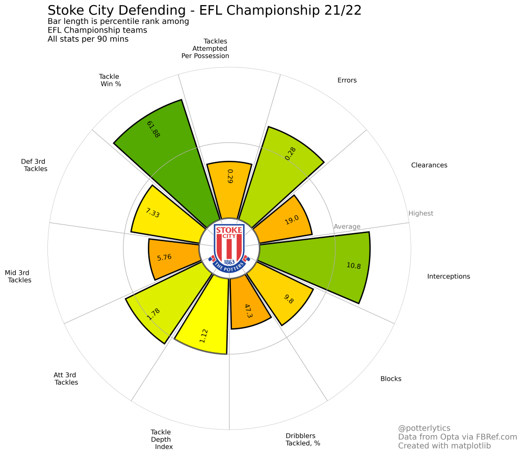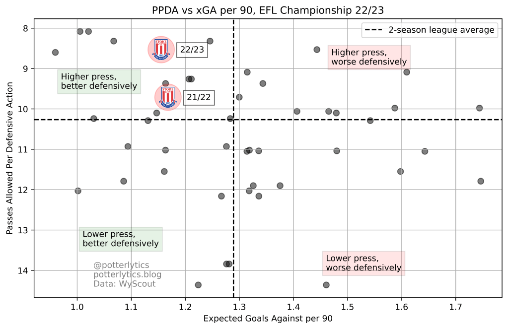 Indeed, looking at the Passes per Defensive Action or PPDA (the average number of passes a team makes before Stoke perform a defensive action, e.g. a tackle or interception), Stoke are one of the most intense pressers in the league.