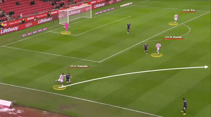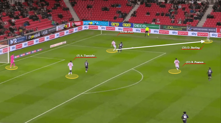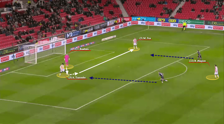 This time, the ball is wide left of the Sunderland attack. We notice that Ki-Jana Hoever has pressed the ball aggressively, and as such, Ben Pearson has dropped into the right back position, Smallbone has dropped into defensive midfield, and Brown has dropped centrally into Smallbone’s initial role.