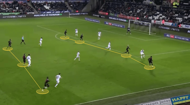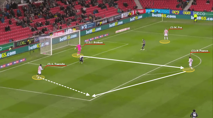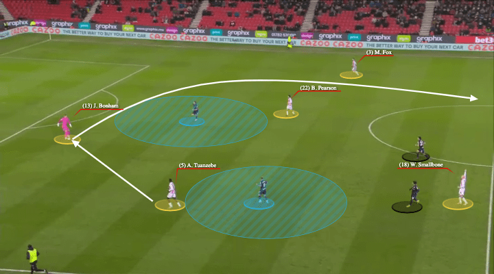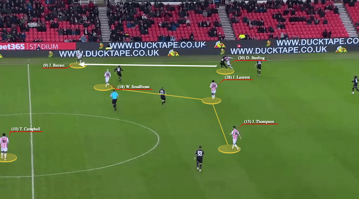 In this first clip, we see Stoke set up relatively similarly to previous games, but this time Smallbone presses the ball, leaving his man-marking position. As he does this, Brown moves across to cover and pass back across.
