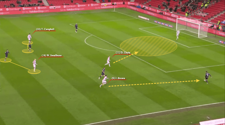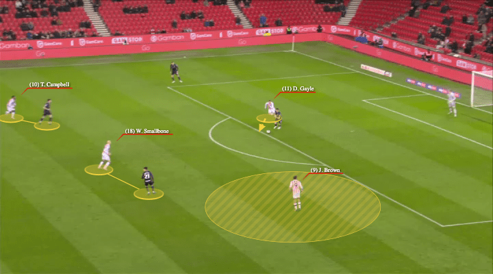 So we see that there can be a slight change in specifics of the press, in this case Will Smallbone pressing forward alongside Brown in more of a 4-4-2 high block. We’ve also seen specific responses to opposition styles, such as Campbell dropping off and marking man-to-man to stop Blackburn’s inverted right back from overloading the centre of the pitch.
