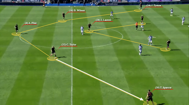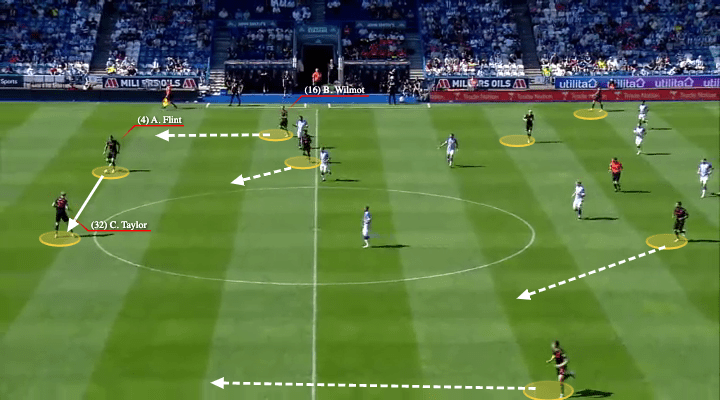 1 – The central striker (number 11, usually Gayle, although in his absence this role has gone to Jacob Brown and Nick Powell) makes a curved pressing run towards the ball. The curving of the run cuts off one passing lane for the player in possession, forcing the ball into a specific area, starting the trap. The pass can only go one way, as behind the front 3 all players are closely man-marking.