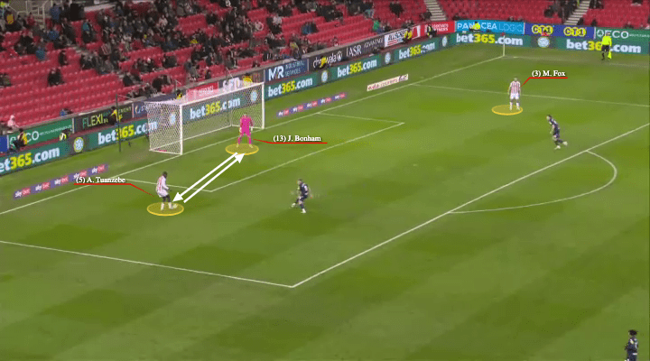 3 – The centre back (5) plays the ball long to the front line, where Stoke’s aggressive man-to-man press is waiting. Josh Laurent (28) steps in front of the waiting opponent and nicks the ball back.