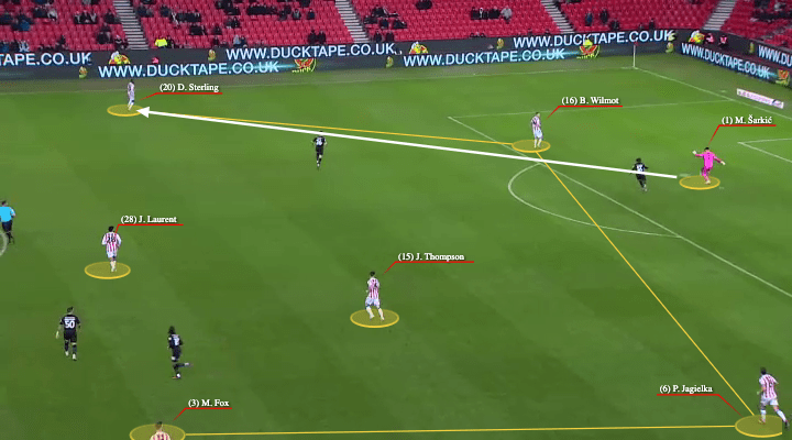As such, we see the Norwich centre back attempt to bypass Stoke’s press by launching it long into the wide player on the left. Again, Stoke’s man-to-man press is waiting for exactly this, and right-back Sterling launches in aggressively to intercept the ball.