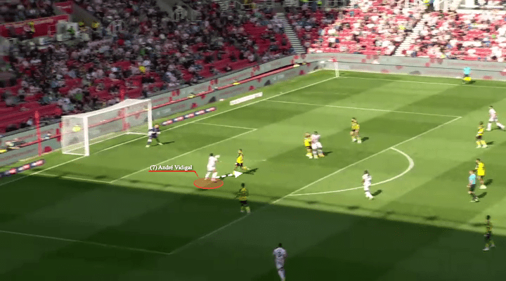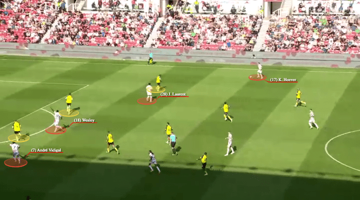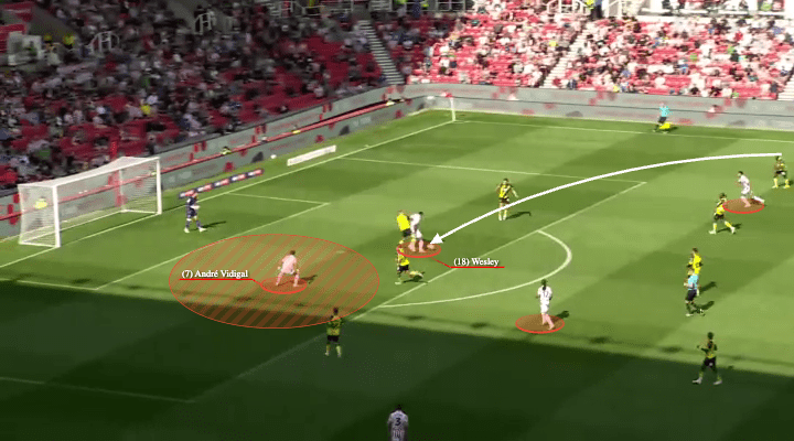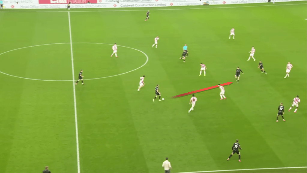 As the wing back gets the ball, he has 10 yards between himself and Wilmot, and a massive space to drive into with the ball. There’s a 4v4 on Stoke’s back line, and a huge gap in front of them to the recovering Seko and Manhoef.