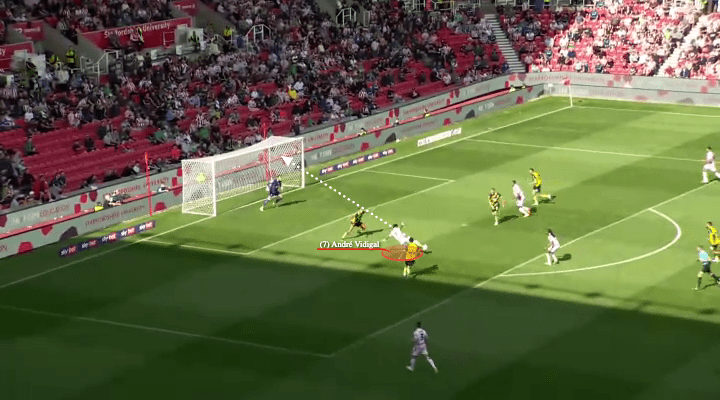 In the end, the wing back has a very easy time driving into the Stoke box, and as Stoke’s defence recover well to defend the 6 yard box (more on this later), passes to the late arrivers into the area are free, and in the end Johansson’s save keeps the score at 0-0.