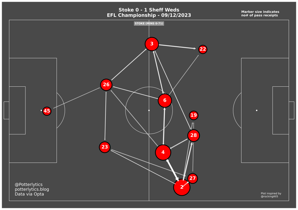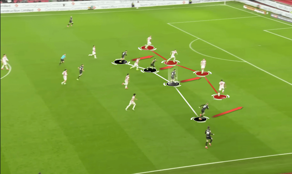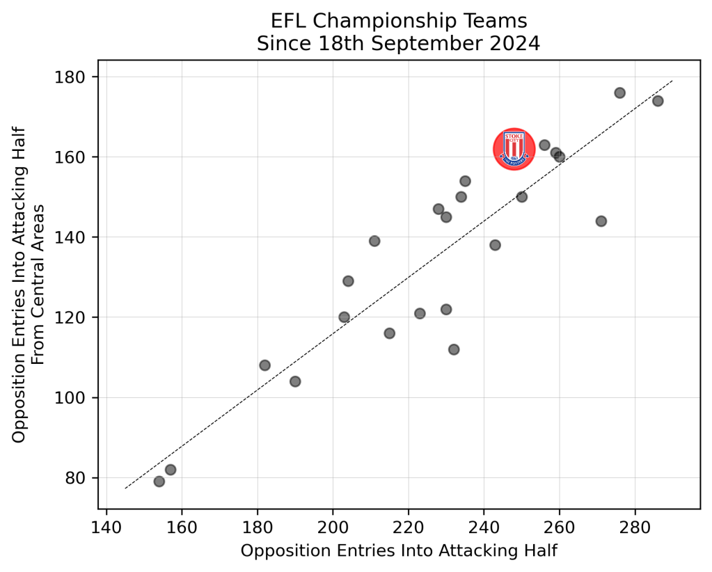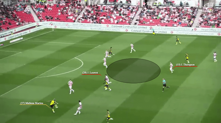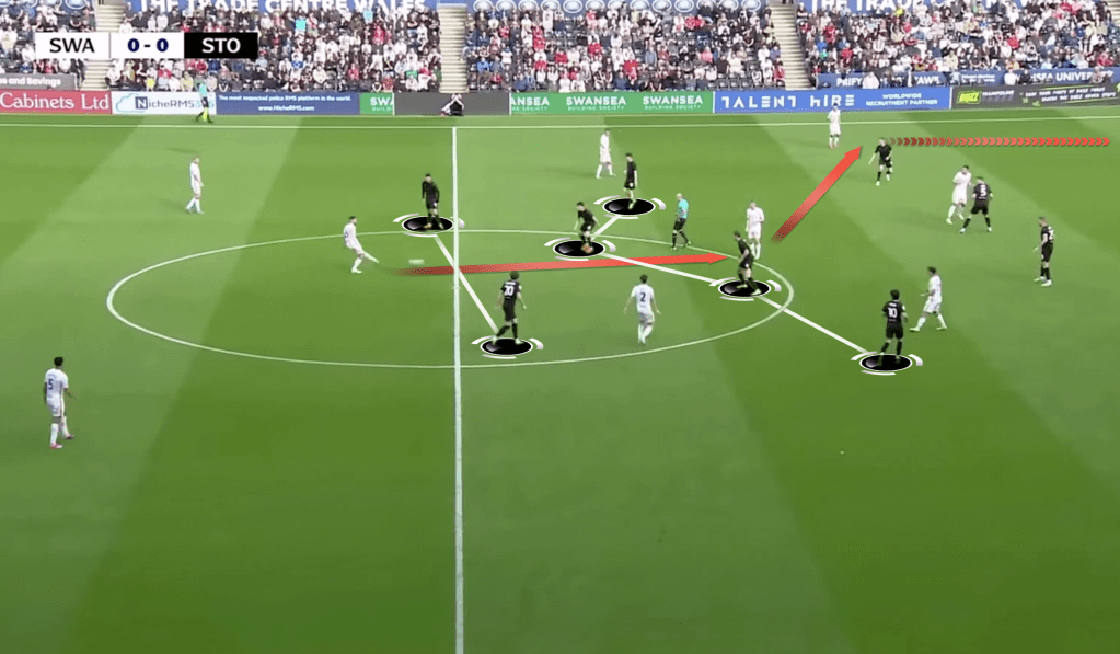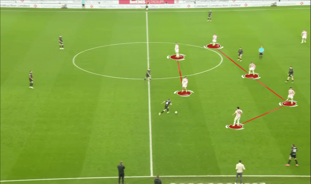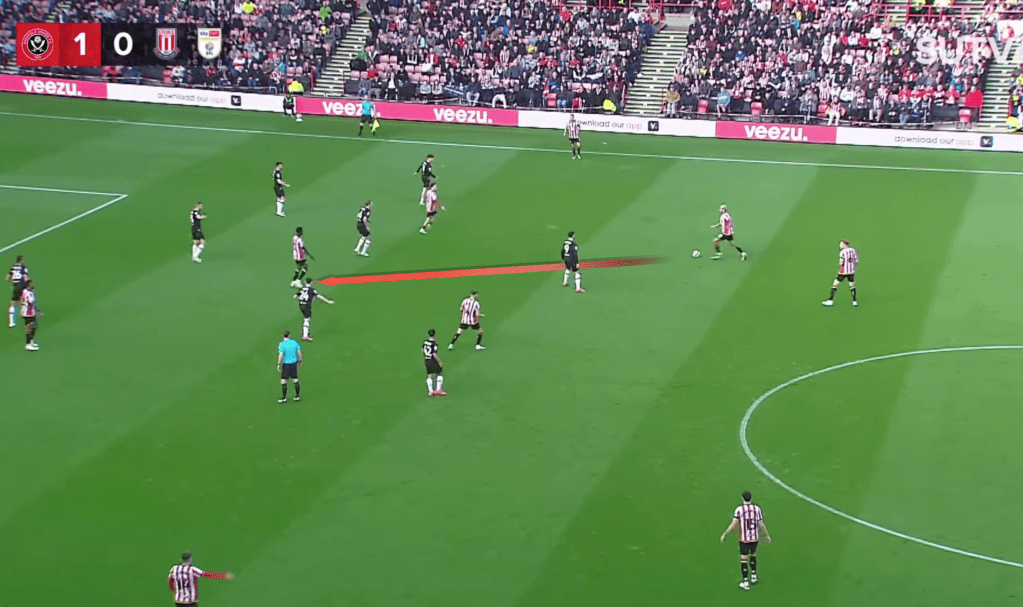Opposition build-up simply plays around Stoke’s compact and narrow lines, and manages to consistently get into dangerous areas wide of the box.