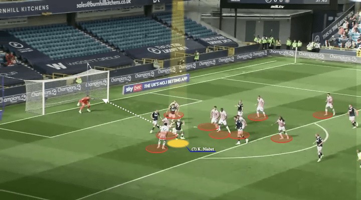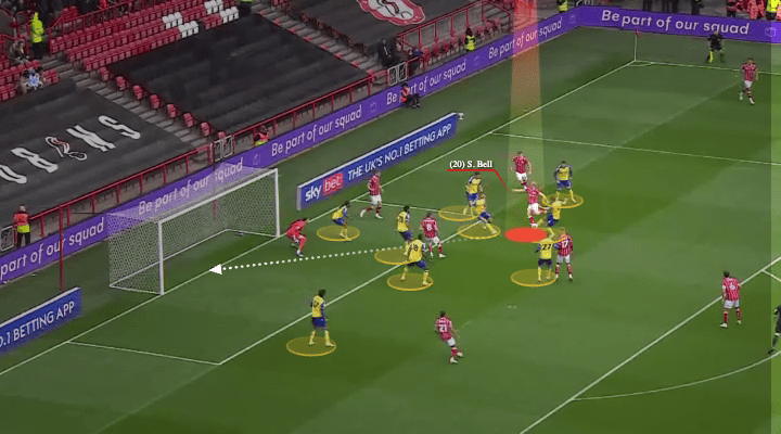 In the blue dotted area is a 3v1 on Junior Tchamadeu (and the eventual goal comes from a ball deflected to the back post), and in the yellow zone is something we often see with Stoke’s shape, a massive gap on the edge of the penalty area as everyone defends the 6 yard box.