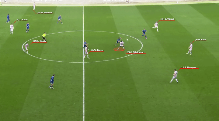 Wilmot (spotlighted) is stuck between marking the central player and the wide player, as Seko (the deeper of the midfielders, is 10 yards off.