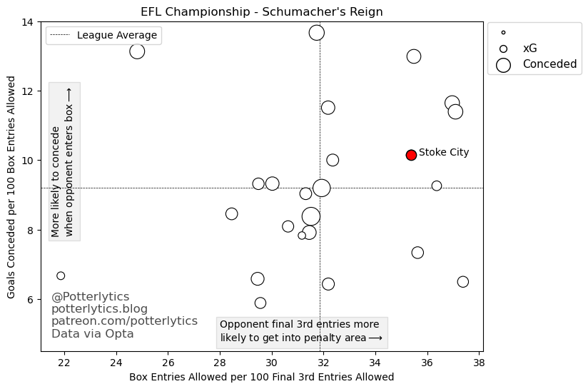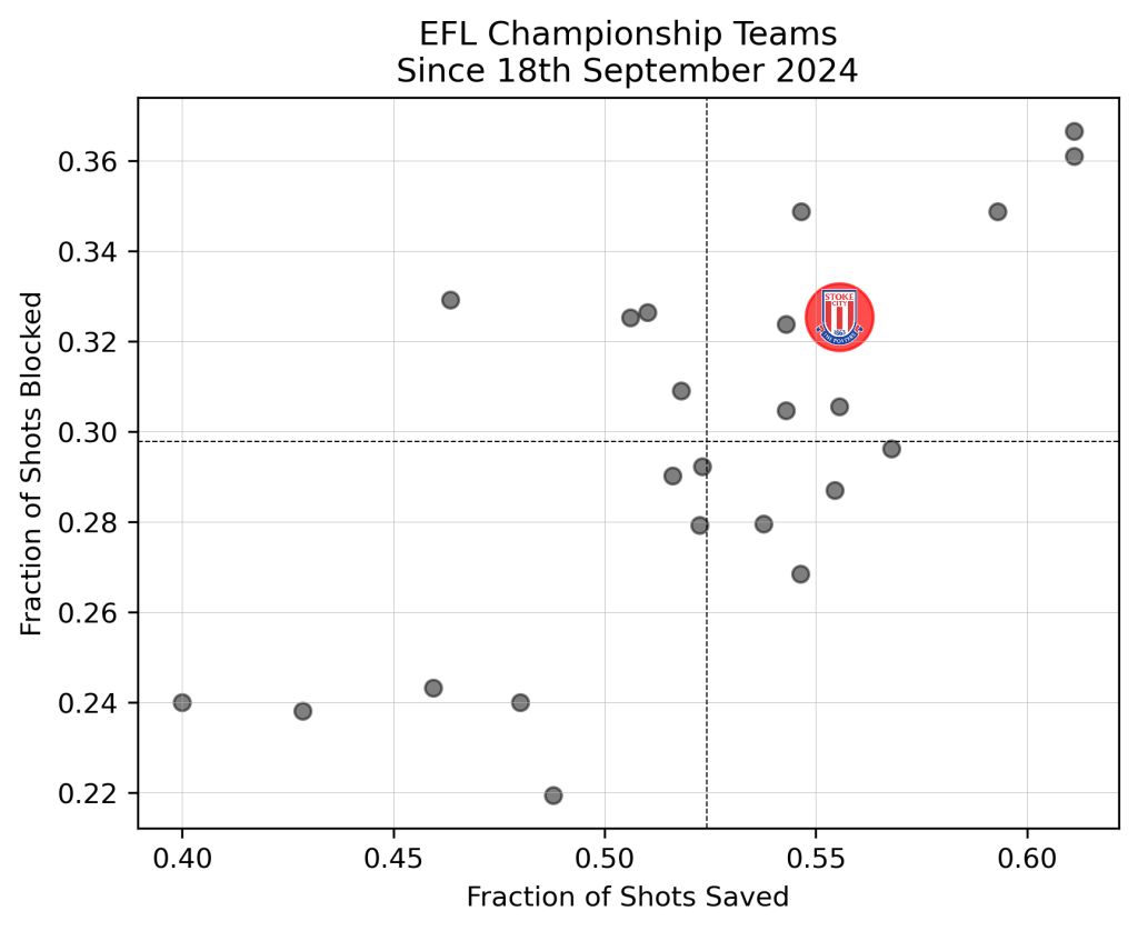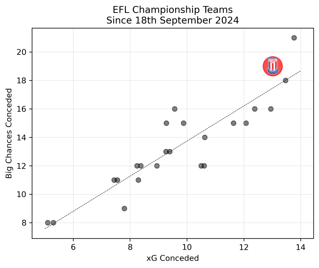 Stoke have now conceded more shots than any other team in the division, and more xG than all but one side in Plymouth Argyle. They’re not close to the defences above them either, sitting almost 5xG conceded worse than Oxford United.