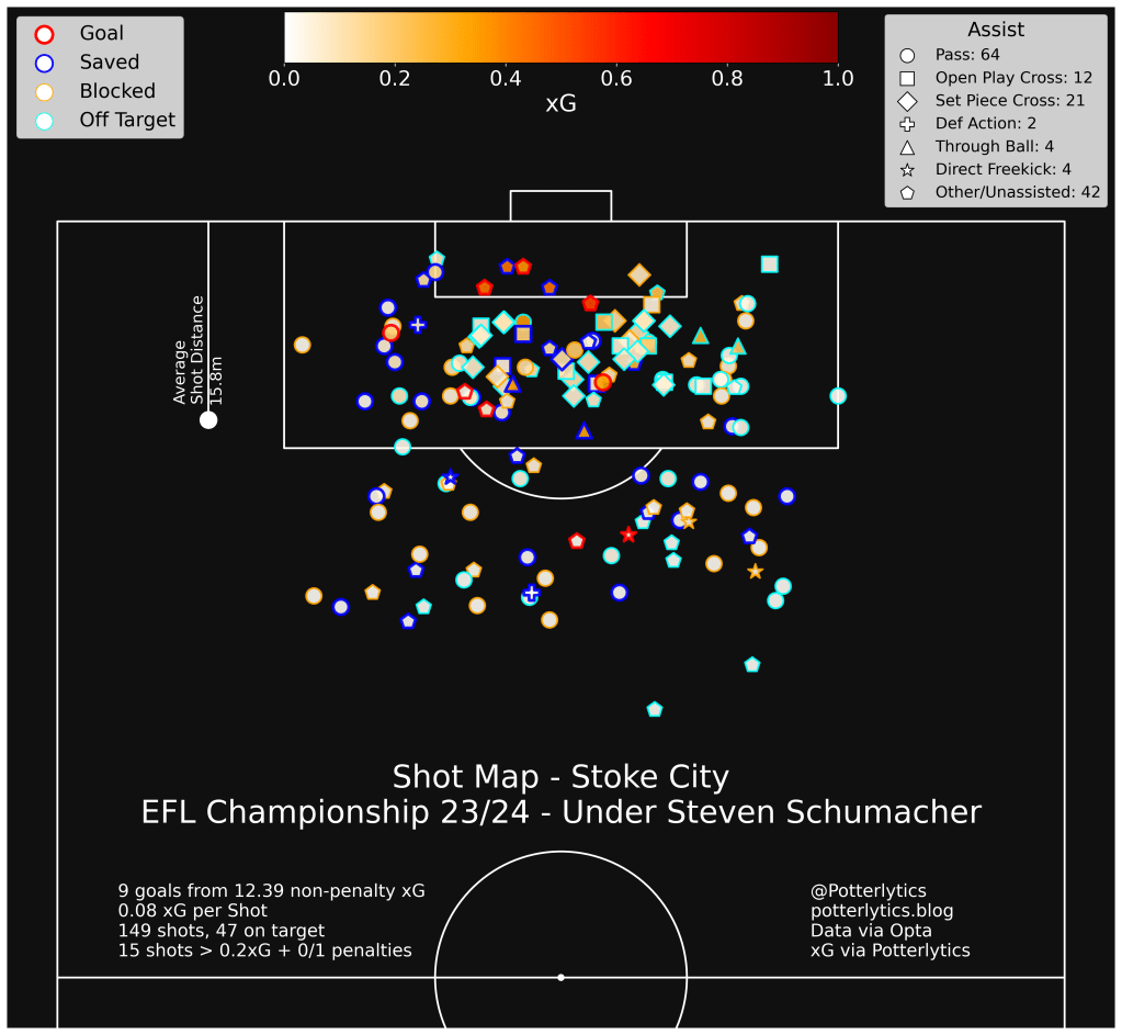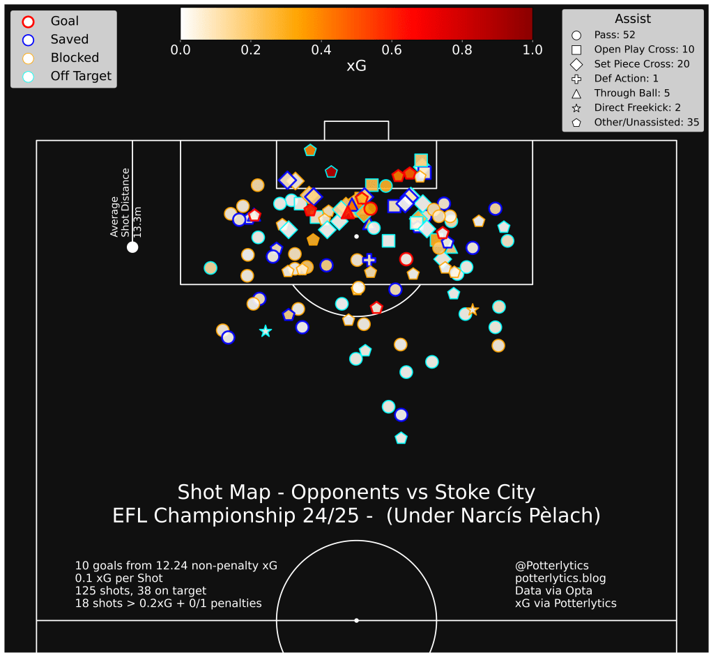 Looking at the table, Stoke have only conceded 28 in 21 (22 in 16 under Pèlach), with 4 of those being own goals (more on that later). This disconnect is why I’m not too keen to call Pèlach and the team currently ‘unlucky’ for those poor decisions.